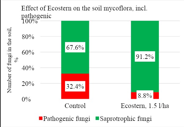 Conform rezultatelor analizei micologice, s-a constatat o scădere a micoflorei patogene a solului în medie pentru ferme de 4 ori - de la 32,4% în martor la 8,8% în cazul aplicării produsului (vezi diagrama). Ecosternul a prezentat o eficiență ridicată împotriva agenților patogeni din genurile Fusarium (agent cauzator al putregaiului Fusarium, putregaiul rădăcinii Fusarium, putregaiul capului Fusarium), Rhizopus (parazit facultativ, în condiții favorabile poate provoca putregai negru), Alternaria (cauzează „punctul negru” al sâmburilor) Gliocladium (afectează plantele slăbite și provoacă putrezirea rădăcinilor; ciuperca are o activitate antagonistă ridicată, care determină răspândirea sa în sol). De asemenea, ciupercile patogene din genurile Aspergillus, Alternaria, Penicillium sunt agenți patogeni ai putregaiului semințelor.